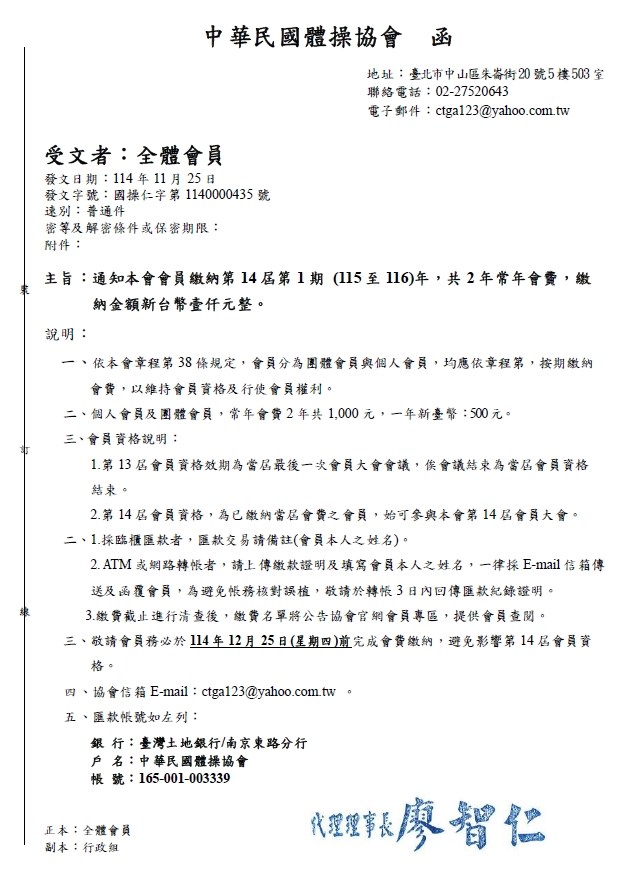 通知本會會員繳納第14屆第1期 (115至116)年,會員會費